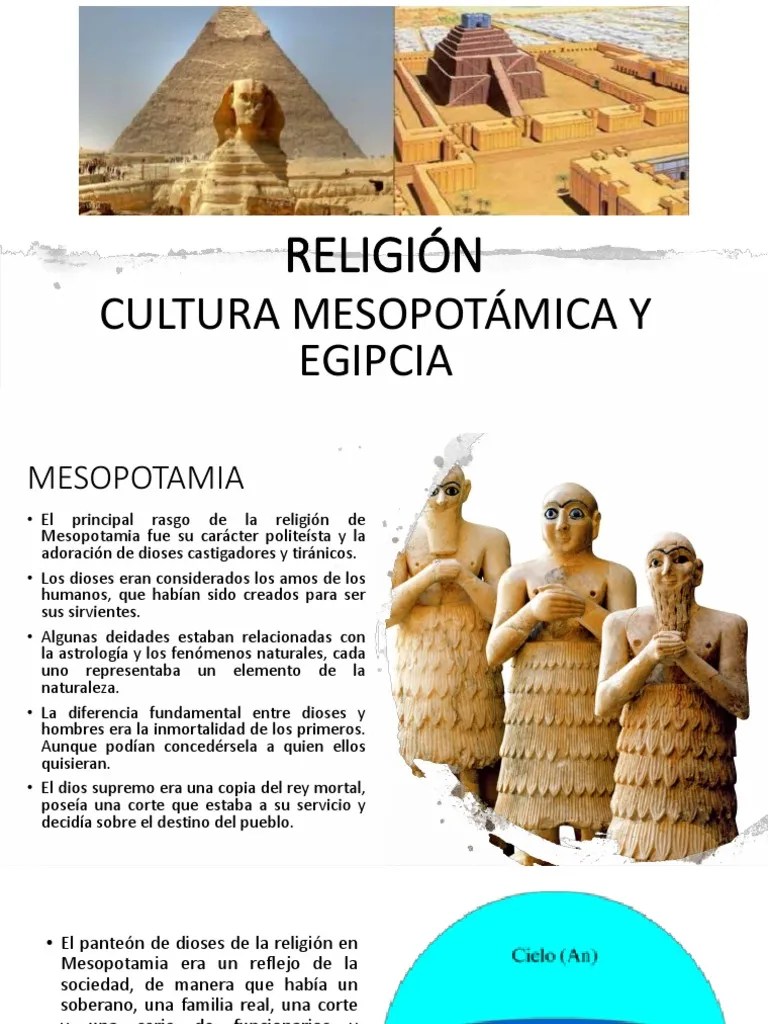 Entre las principales características de la religión egipcia se destacan las siguientes: Entre las principales características de la religión egipcia se destacan las siguientes: Lo anteriormente expuesto se denomina henoteísmo, que es una variante de la religión politeísta. Esta región tiene una gran importancia histórica, ya que fue allí donde se comenzó a practicar la agricultura, se fundaron las primeras ciudades y aparecieron las primeras civilizaciones. La mesopotamia es una región del asia occidental ubicada entre los ríos tigris y eufrates, así como en sus terrenos circundantes.en esta región surgió durante la edad antigua la llamada civilización mesopotámica. Fue politeísta, es decir, creía en varios dioses.; Hoy en día la mayoría de las religiones del pasado son politeístas y se.